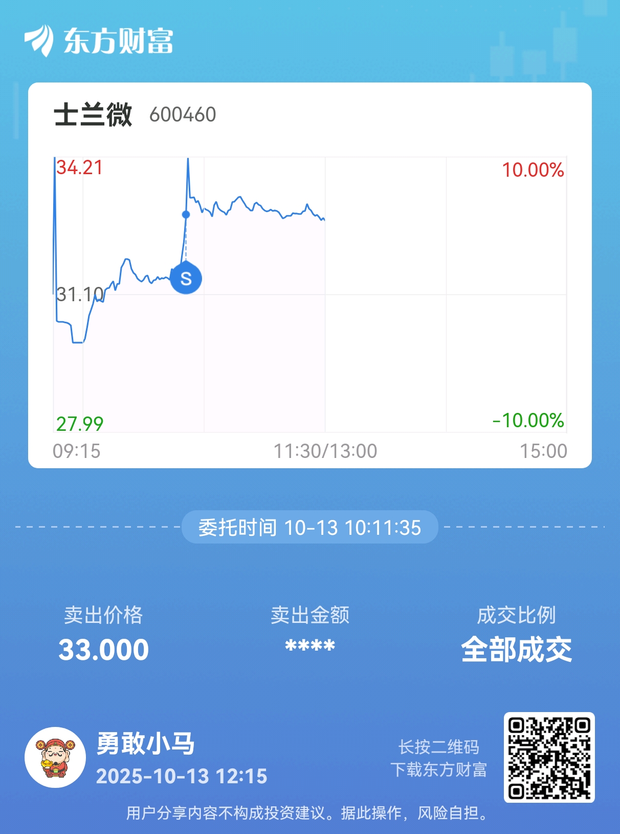 $士兰微(SH600460)$ 挂了33,居然卖出了,不会卖飞吧。