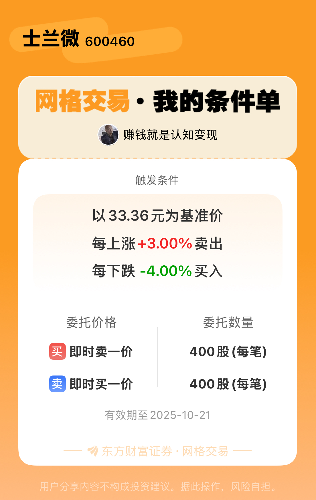 #条件单交流# #网格交易晒单# 一位股神设置了一个网格交易条件单,接下来就是见证奇迹的时刻~$士兰微(SH600460)$