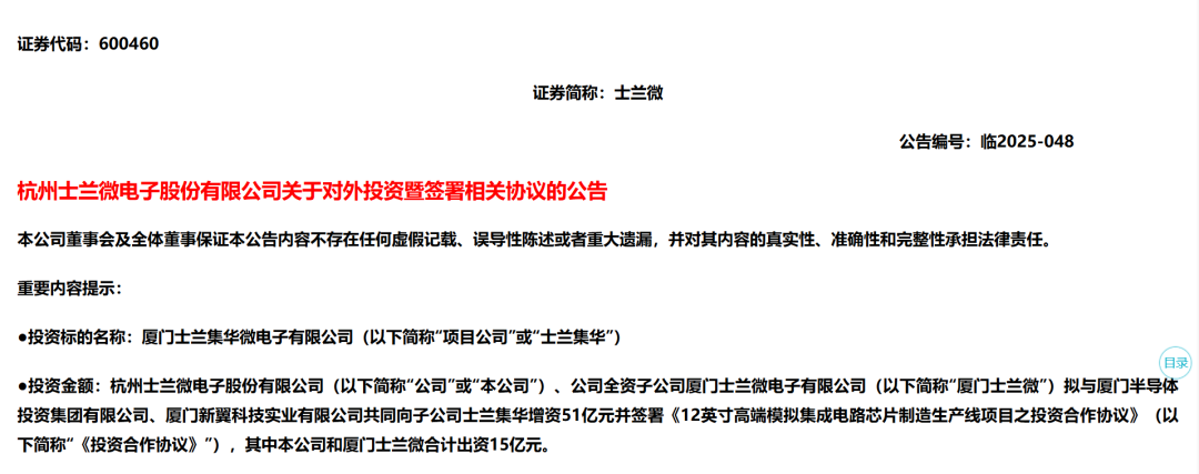 10月19日晚间,士兰微发布公告称,为加快完善公司在半导体产业链的布局,公司与厦门市人民政府、厦门市海沧区人民政府于2025年10月18日在厦门市签署了《12英寸高端模拟集成电路芯片制造生产线项目战略合作协议》(以下简称“《战略合作协议》”)。同时,为落实前述《战略合作协议》,公司、公司全资子厦门士兰微与厦门半导体投资集团有限公司(以下简称“厦门半导体”)、厦门新翼科技实业有限公司(以下简称“新翼科技”)于同日签署了《12英寸高端模拟集成电路芯片制造生产线项目之投资合作协议》。