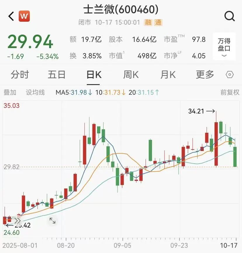 二级市场表现上,自10月13日,士兰微股价触及近期高点34.21元后一路下探,截至10月17日,士兰微以29.94元/股收盘,当日大跌5.34%,最新市值为498亿元。