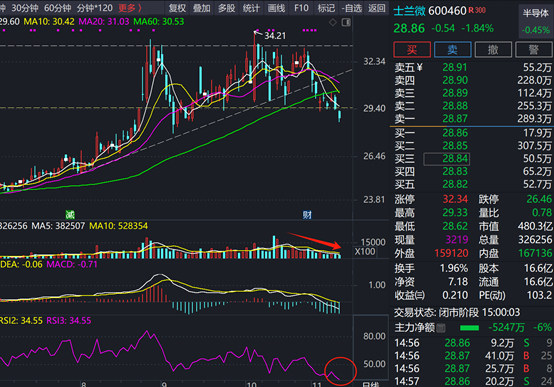 士兰微近一段时间在接近前高34.21的位置附近横盘震荡,测试一段时间后向下选择方