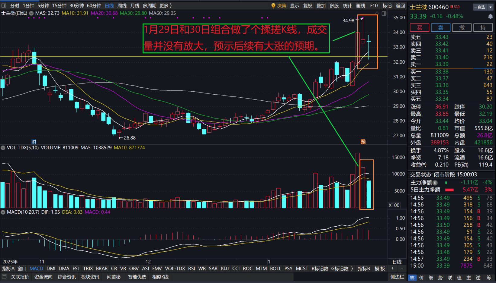 今天大盘大跌时,缩量下跌了,尾盘一直控盘很好,收出长下影K线,这根K线和昨天的带长上影K线一起组合出一组揉搓K线,是主力大涨前最凶狠的洗盘手法。虽然连续两天下跌,调整价格均在1月28日那根放量阳线内,两天的收盘股价并没有太大变化,加上士兰微最近一年涨幅远远落后于行业,看好它最近应该有一波开启大涨。个人观点,参与讨论,不喜勿喷!