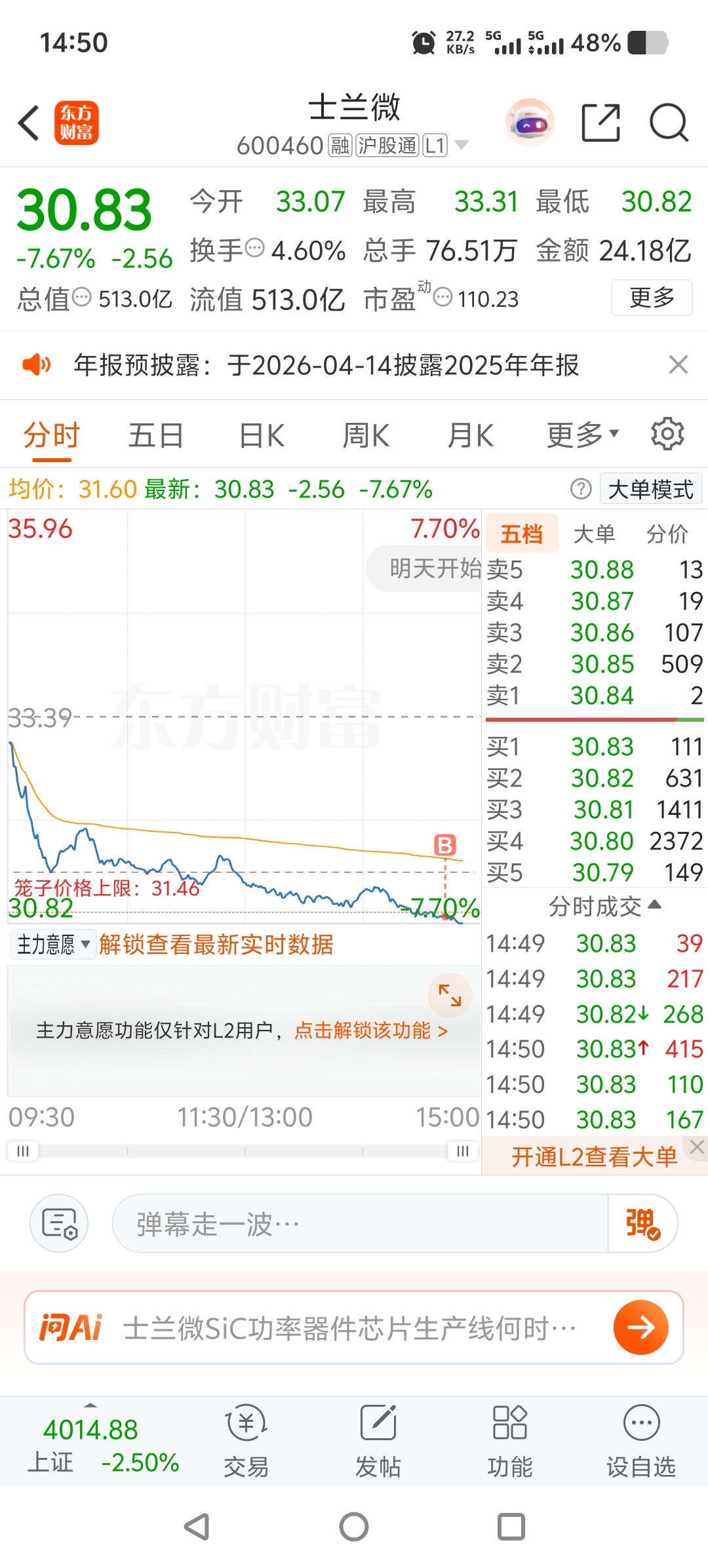 $士兰微(SH600460)$ 超底线