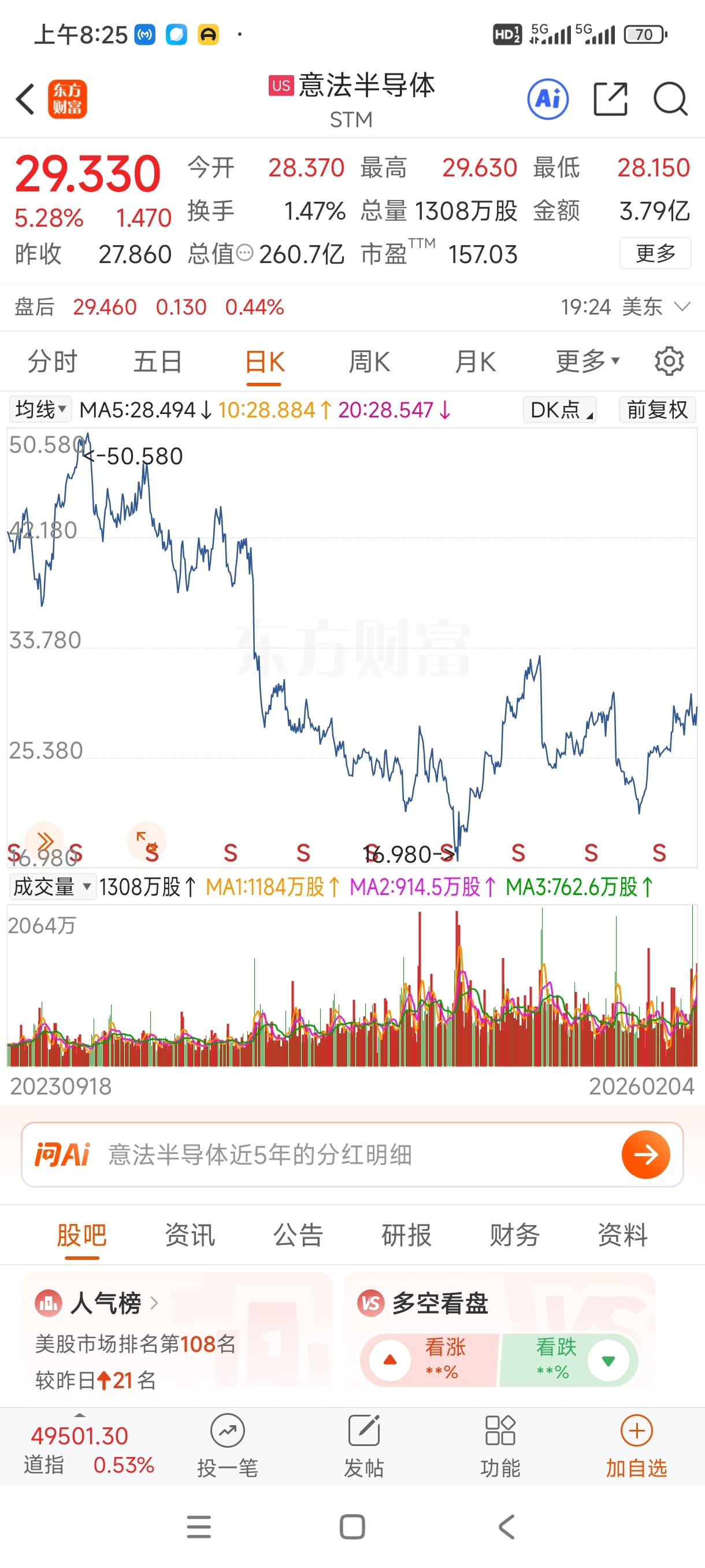看了下,士兰微的走势与美股的意法半天体最为贴近,昨天意法半导体涨5%,今天不会太
