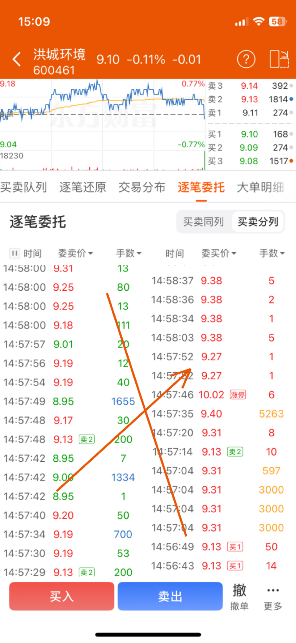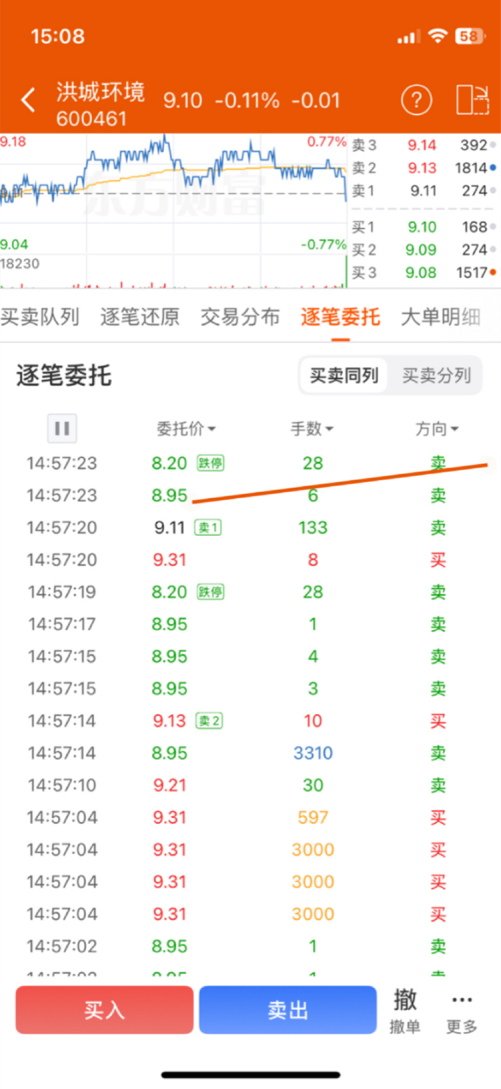 $洪城环境(SH600461)$ 有大单抢尾盘,竞价最高的时候是 9.20,然后9.17停了很久,但是太多人卖了,甚至有人按跌停跑,导致最后绿