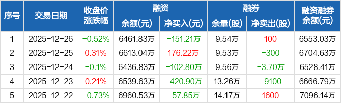 洪城环境:融资净偿还151.21万元,融资余额6461.83万元(12-26)
