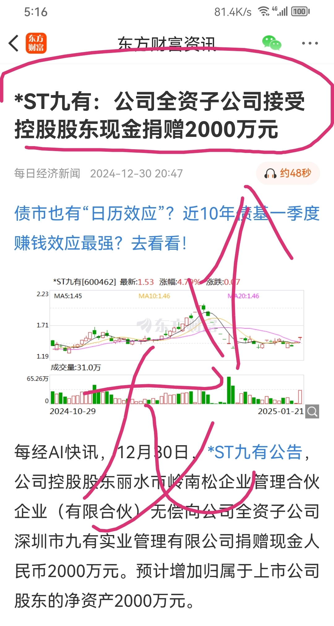 $*ST九有(SH600462)$ *ST九有(600462.SH)发布2024年年度业绩预盈公告,预计2024年度实现归属于上市公司股东的净利润为2072万元左右$药明康德(SH603259)$ $赛力斯(SH601127)$