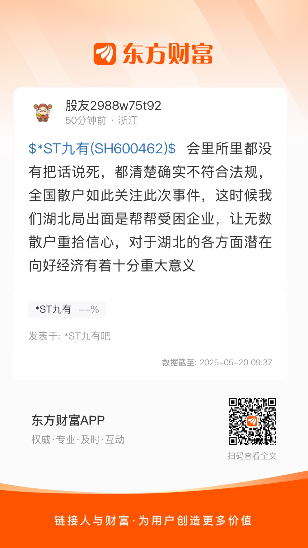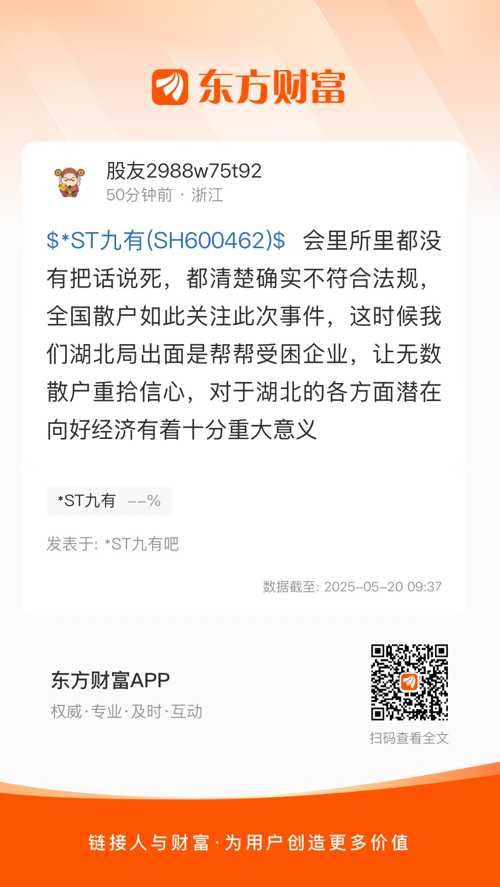 $*ST九有(SH600462)$ 会里所里都没有把话说死,都清楚确实不符合法规,全国散户如此关注此次事件,这时候我们湖北局出面是帮帮受困企业,让无数散户重拾信心,对于湖北的各方面潜在向好经济有着十分重大意义