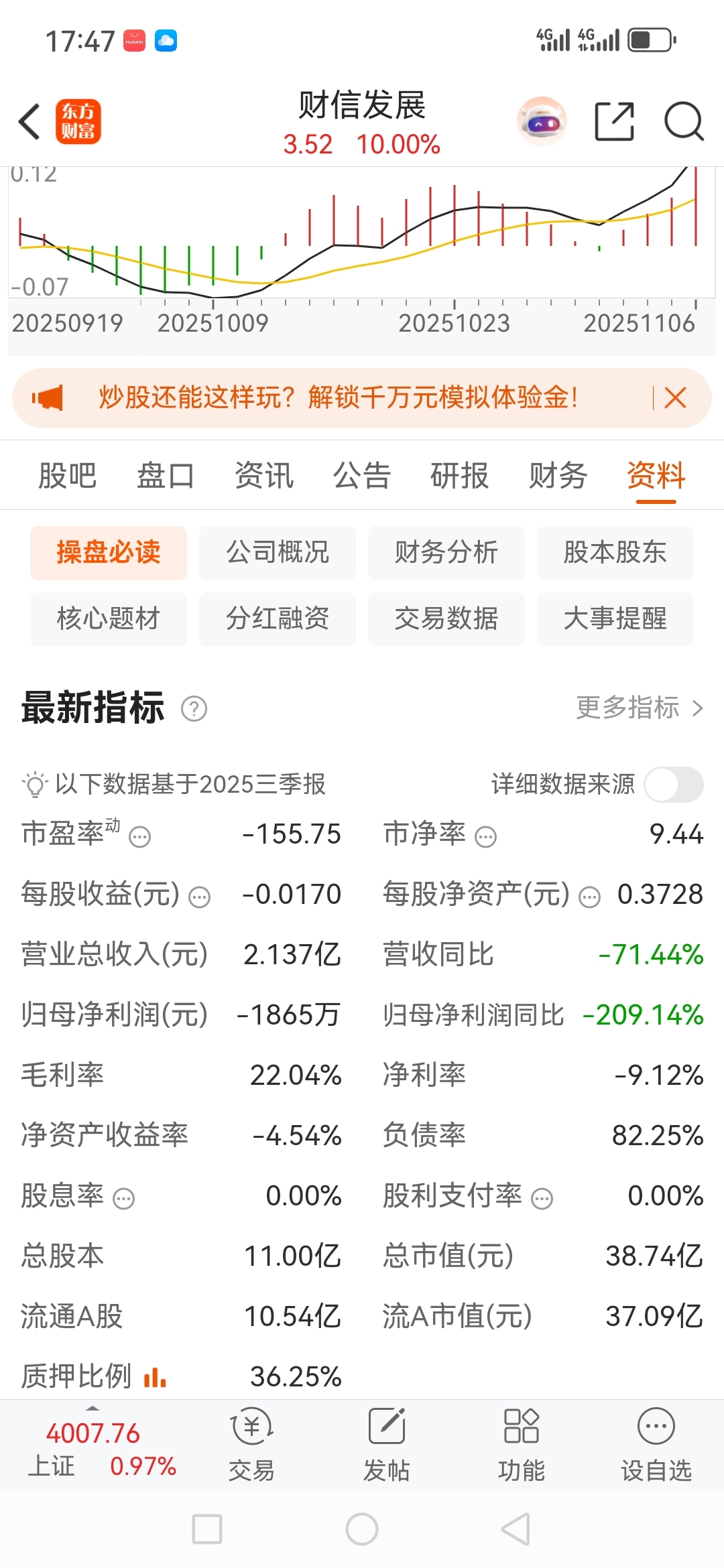 $好当家(SH600467)$ 涨停双响炮后市成妖,财信发展