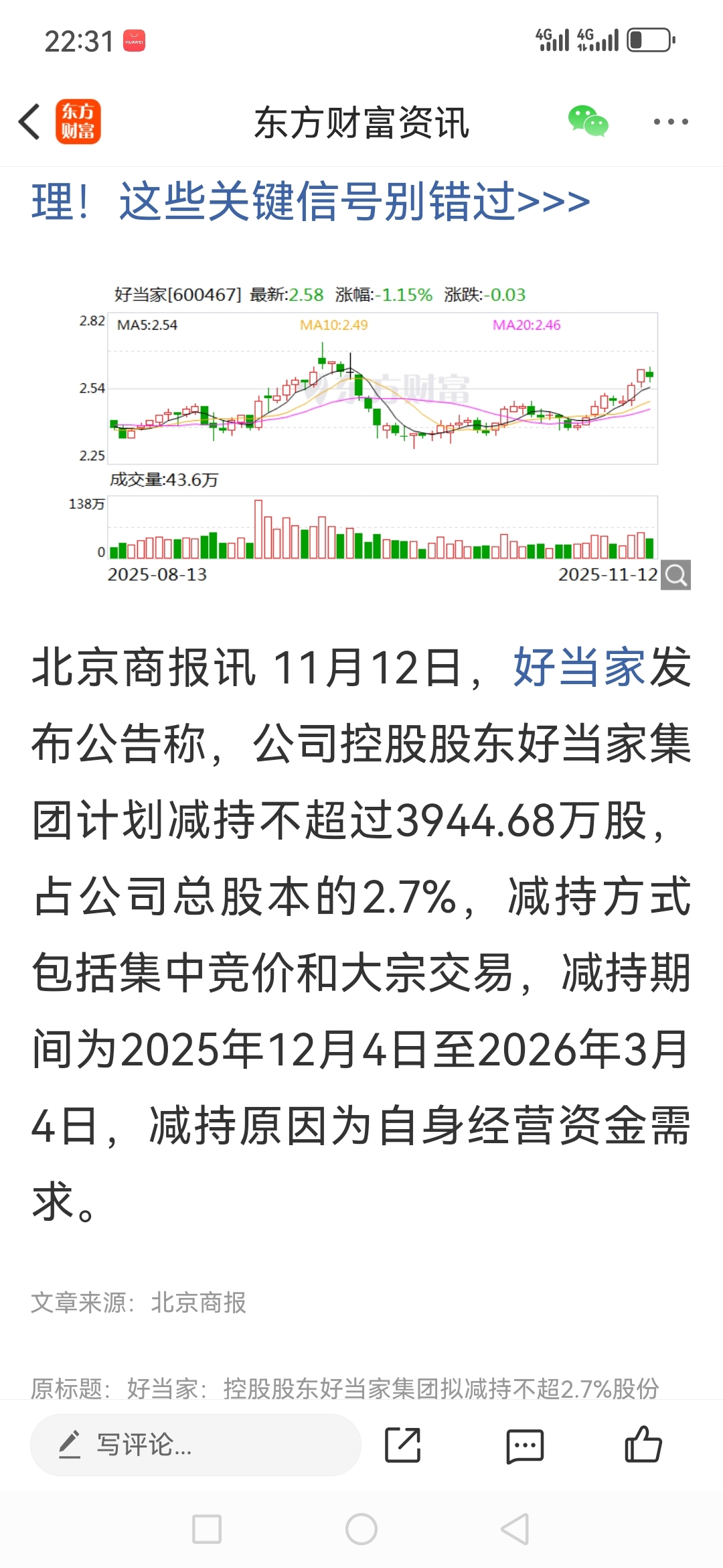 $好当家(SH600467)$ 不就是个减持公告,影响也不大,先来8个一字板跌停……让买卖双方自由交易,横盘3个月,减持计划完成后从新选择方向………