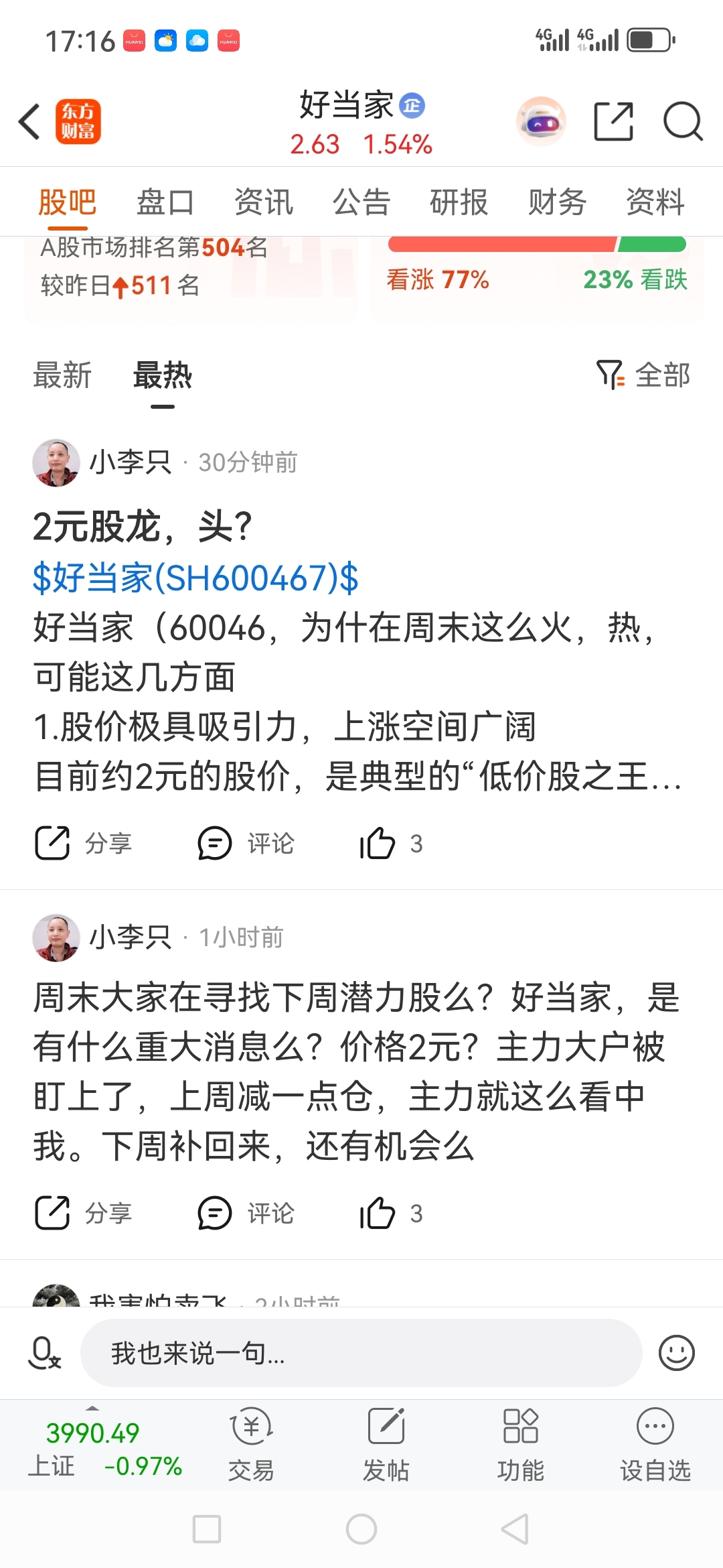 $好当家(SH600467)$ 过不了压力位2.78,就要倒栽葱暴跌下杀………什么炒作题材都没有,业绩差劲,营收萎缩,怎么涨,不要成高位接盘侠,