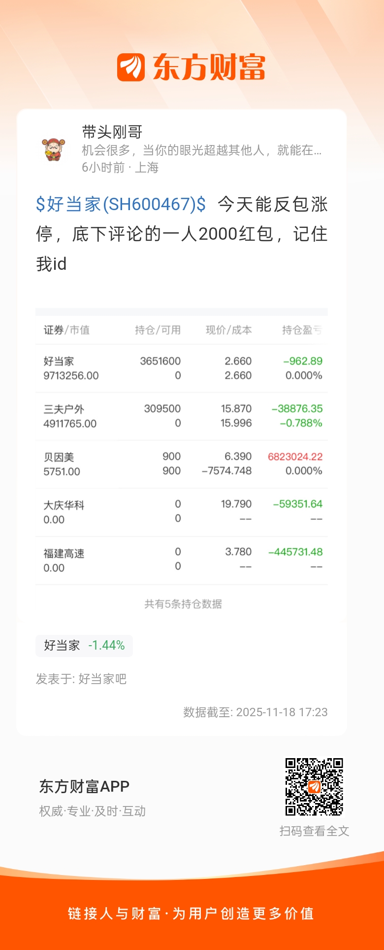 $好当家(SH600467)$  今天能反包涨停,底下评论的一人2000红包,记住我id