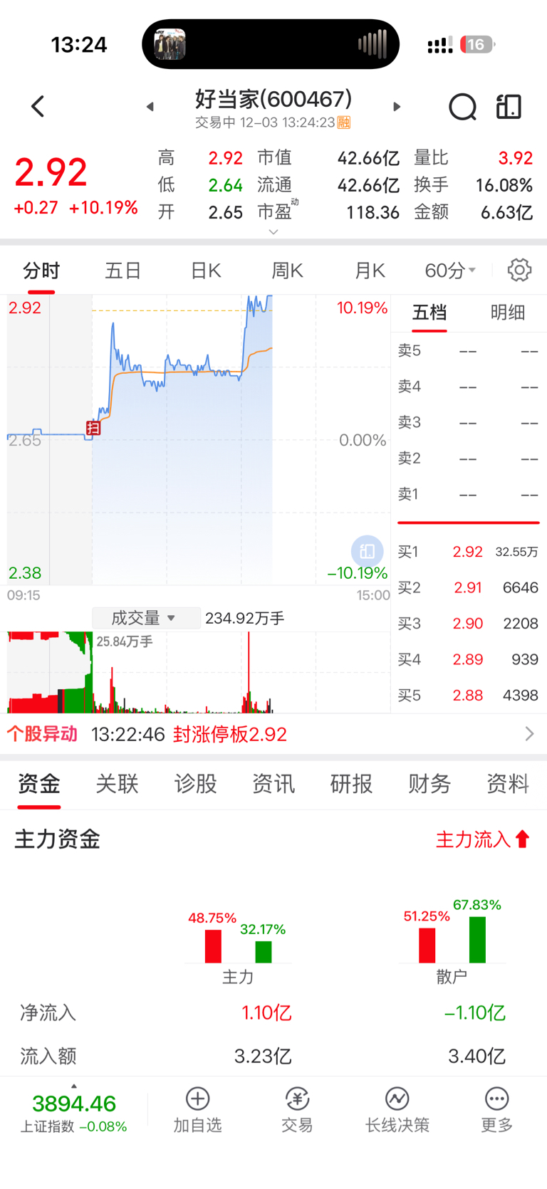 $好当家(SH600467)$ 恭喜坚持不懈到今天的小伙伴,盘中接飞刀,然后一直跌,后面补仓一次,后面实在没钱补了,只能死等,终于感谢主力