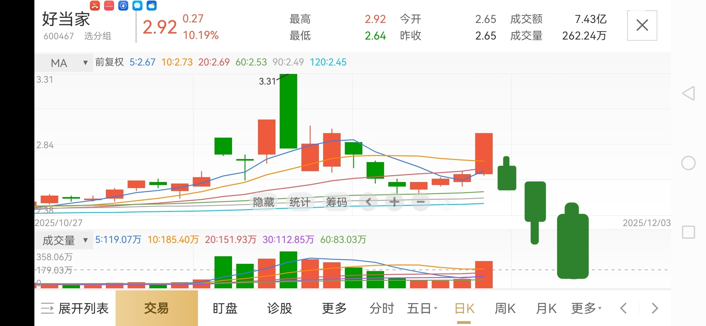 $好当家(SH600467)$ 明天开盘倒栽葱暴跌下杀,2.63收盘,看看换手率,太高了,主力出货套人……………看看大盘下跌………高位接盘套死一大片,风险很大,