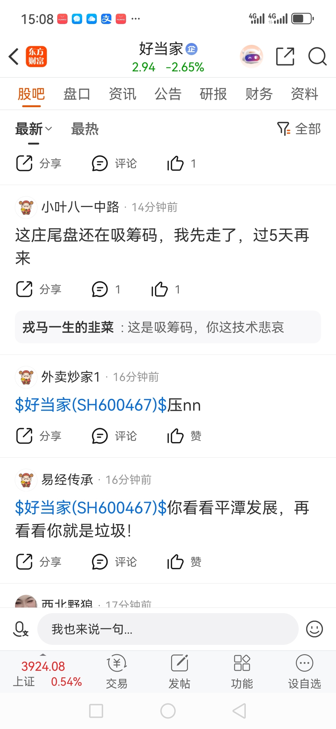 $好当家(SH600467)$ 尾盘吸筹,你眼睛瞎了,………人家故意让你看到的,明天倒栽葱暴跌下杀跌停都有可能…………半个月之类不会涨的,看都不要看………尾盘全部清仓卖出了3000万股