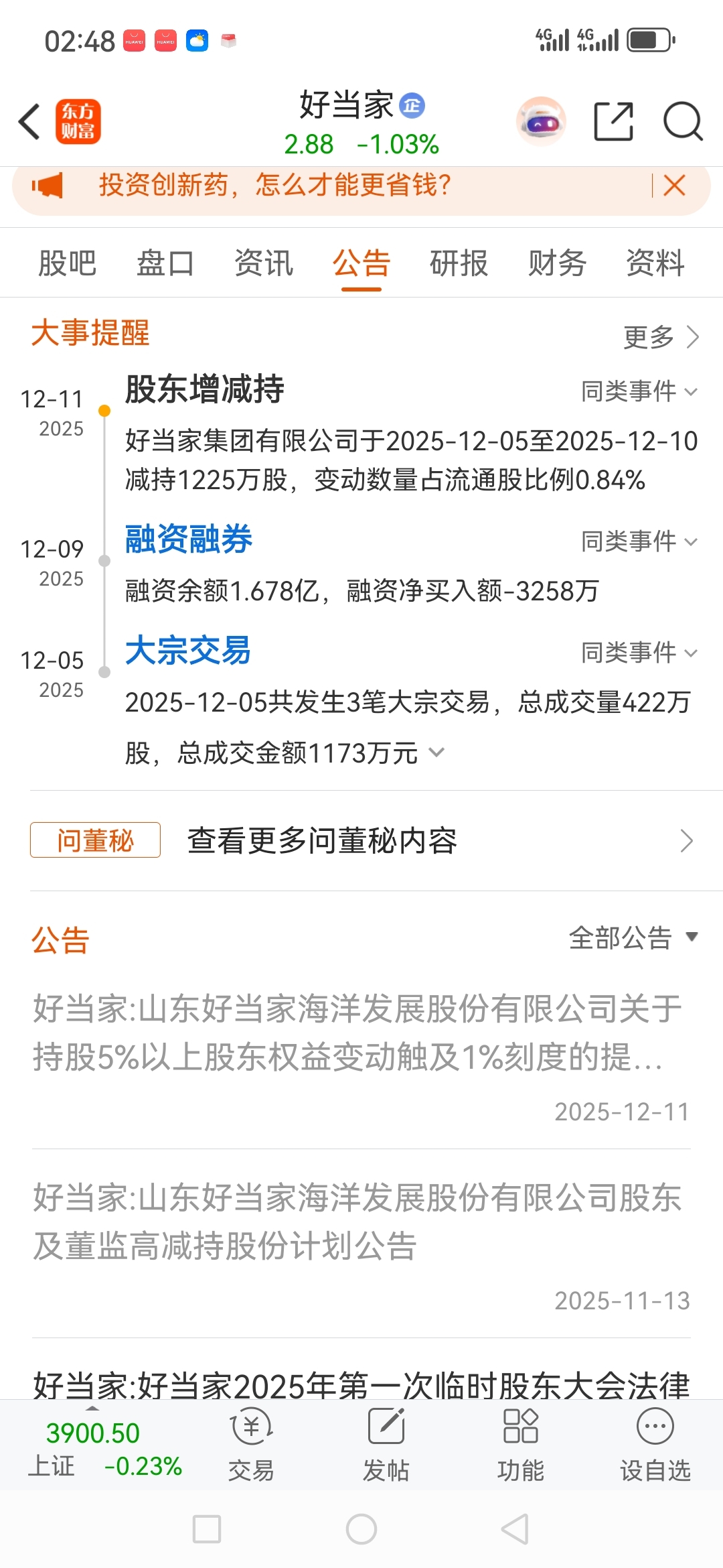 $好当家(SH600467)$ 周三减持803万股……还有2600万股才能减持完毕,这里面大宗交易还有1200多万股,集合竞价1200多万股………估计下周应该提前就减持完毕了,不用到3月份,………也有可能老唐还想股价涨高点,再买,可以多套点钱………哪样减持进度就慢了………