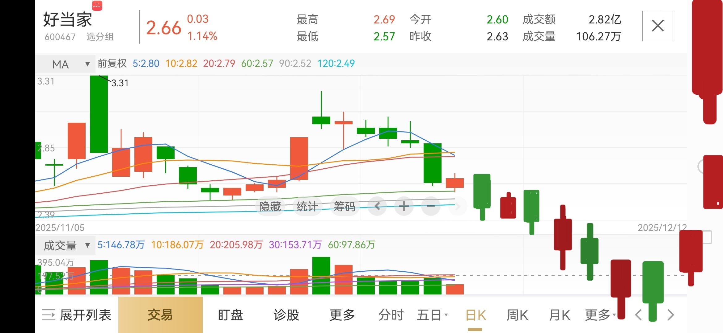 $好当家(SH600467)$ 下周破破跌破2.5,然后再等到2.35左右买进3000股,不不,太少了,跌到2.35我要找我表叔王健林借点钱,借2个亿,买进好当家8000万股………