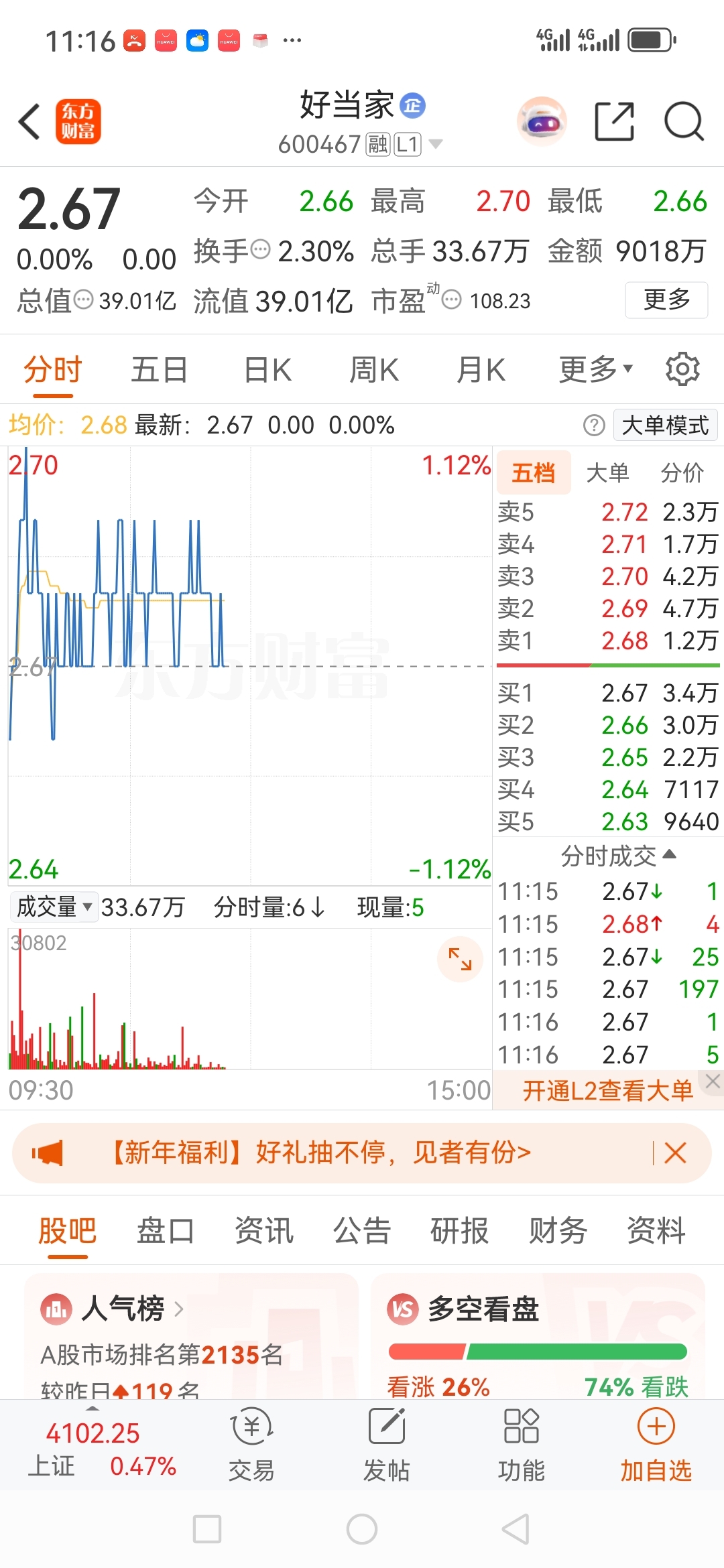 $好当家(SH600467)$ 5档卖盘15万手的抛压盘,本周不用看,最后一天,随它去吧,不能买,下周会出现2.3买点………