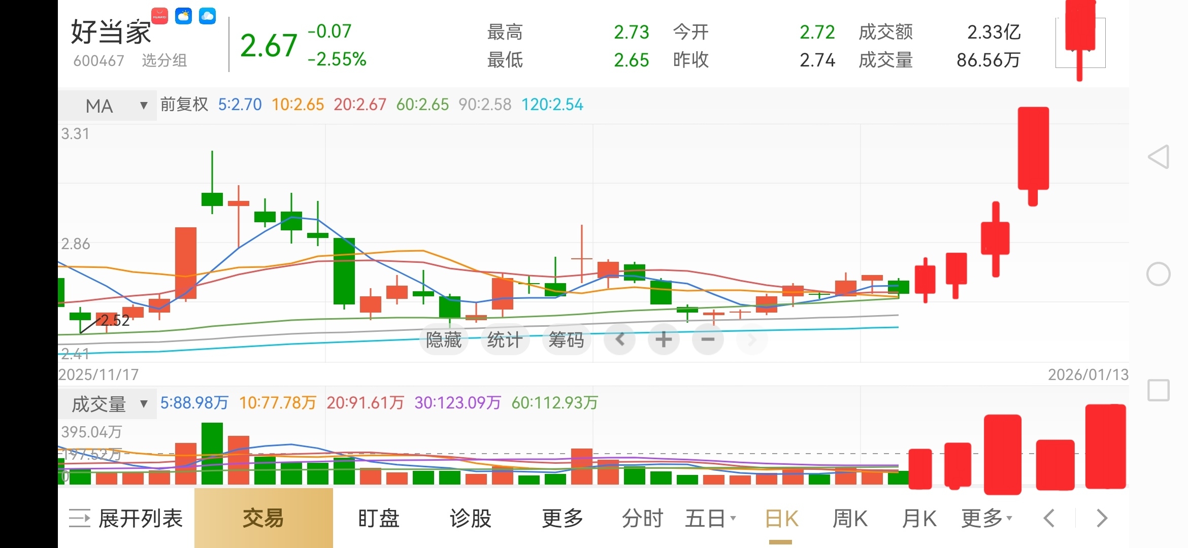 $好当家(SH600467)$ 今天肯定洗出了不少人,大家不要失去信心,没有一直不涨的股票,也没有一直跌的股票,也没有一直涨的股票,股票有涨有跌正常,大家不要失去信心,不要太悲观,要相信自己,明天会更好,从盘面分析来看,好当家快要涨了……勇气,信心,不要情绪化,