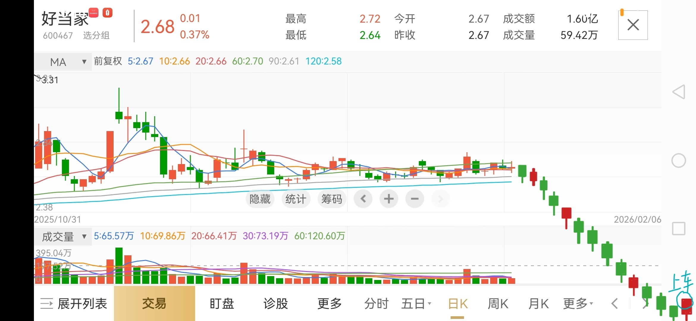 $好当家(SH600467)$ 好多人都认为会涨,周一开盘肯定跌…………冲不过去,上方抛压盘太大了,3.31,3.21,套牢区域抛压很大……短期之内不会涨,大盘高位回调下跌………好当家必然震荡向下回调下跌………等机会上车,散户可以适当小量买一点,打个底仓………万一跌破2.3左右,不是可以全仓买进了………现在买进去,如果阴跌不断震荡向下,折磨你几个月你受得了嘛?………不卖就折磨,卖就是割肉………