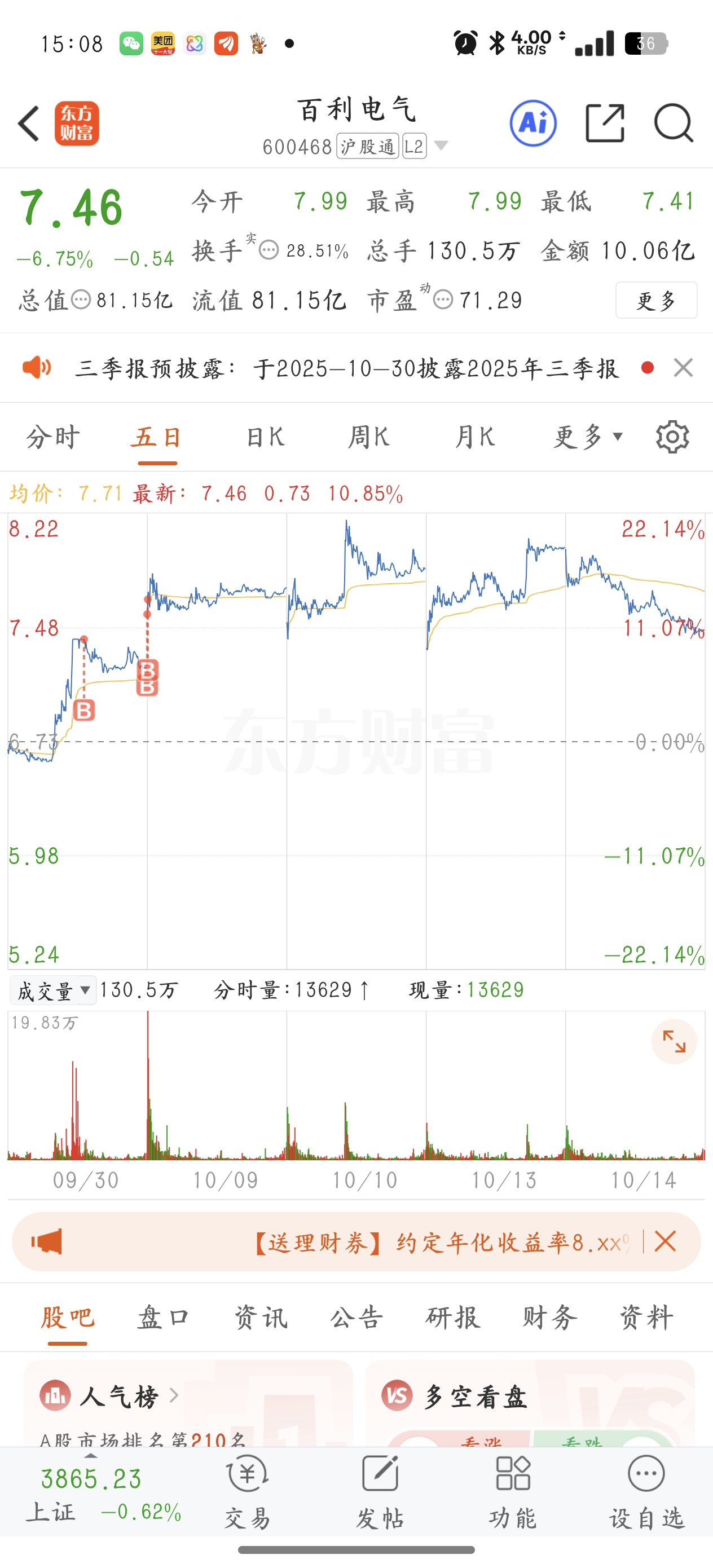 $百利电气(SH600468)$ 送你四个大字,雷打不动,