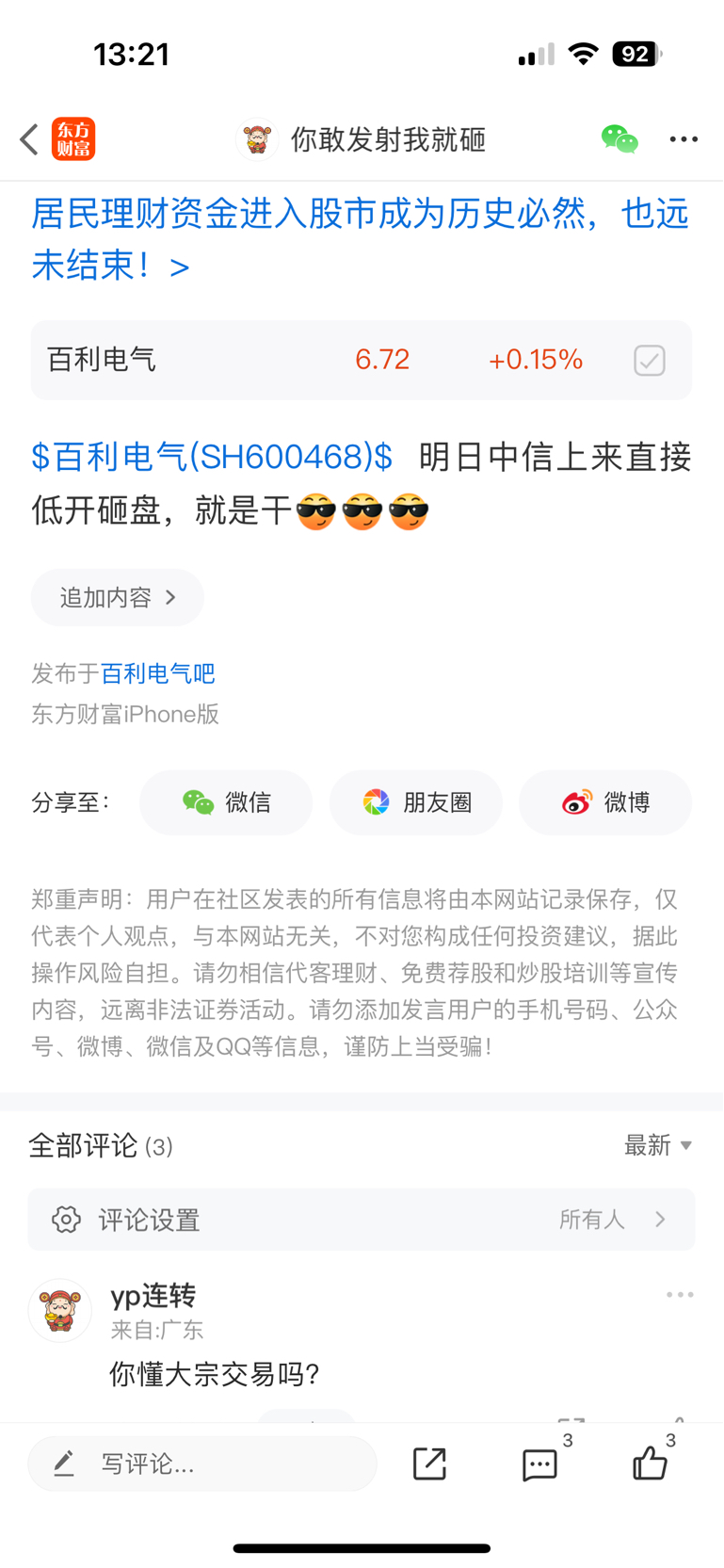 温馨提示: 1.根据《证券法》规定,禁止编造、传播虚假信息或者误导性信息,扰乱证券市场;2.用户在本社区发表的所有资料、言论等仅代表个人观点,与本网站立场无关,不对您构成任何投资建议。用户应基于自己的独立判断,自行决定证券投资并承担相应风险。《东方财富社区管理规定》