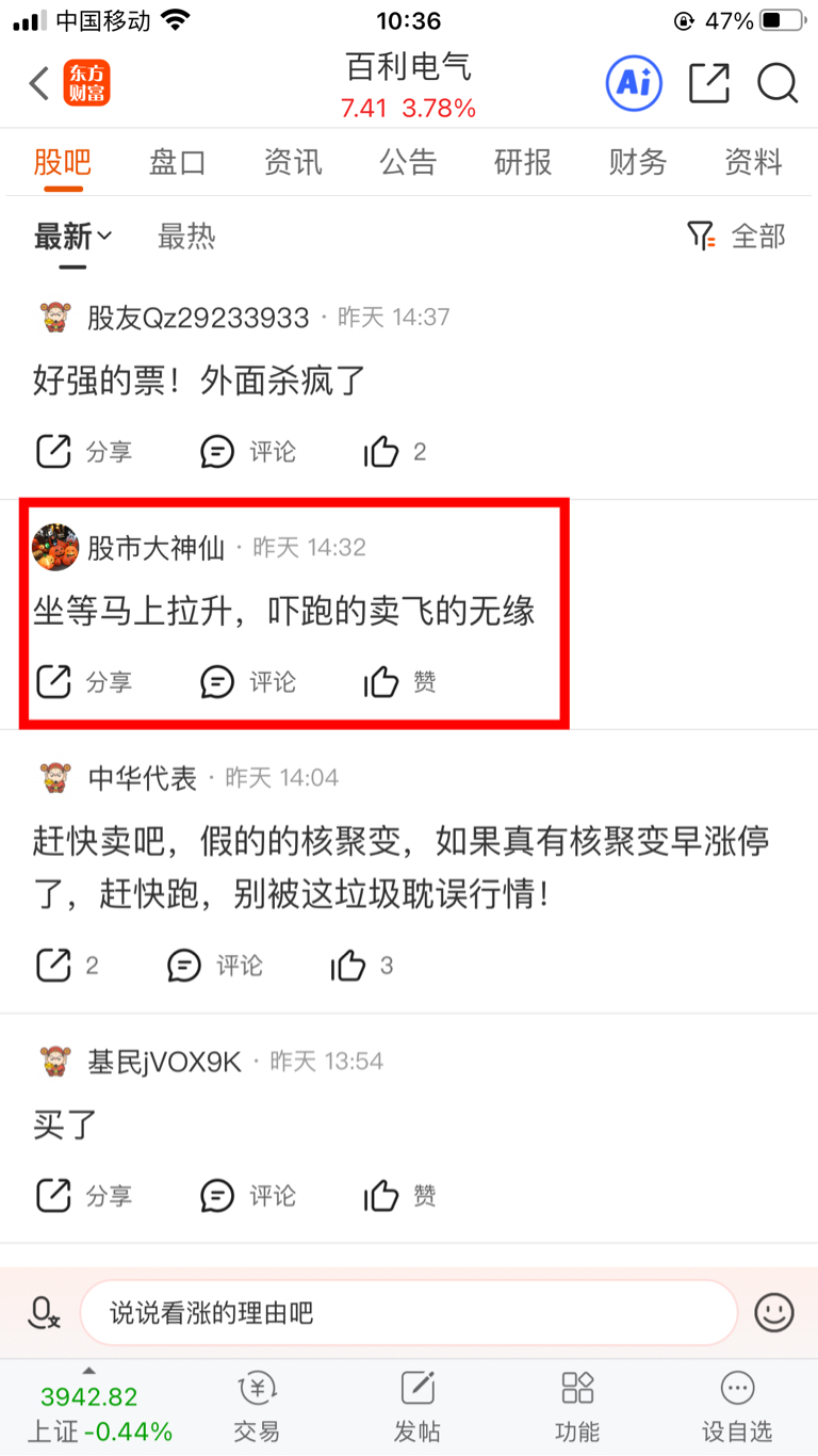温馨提示: 1.根据《证券法》规定,禁止编造、传播虚假信息或者误导性信息,扰乱证券市场;2.用户在本社区发表的所有资料、言论等仅代表个人观点,与本网站立场无关,不对您构成任何投资建议。用户应基于自己的独立判断,自行决定证券投资并承担相应风险。《东方财富社区管理规定》