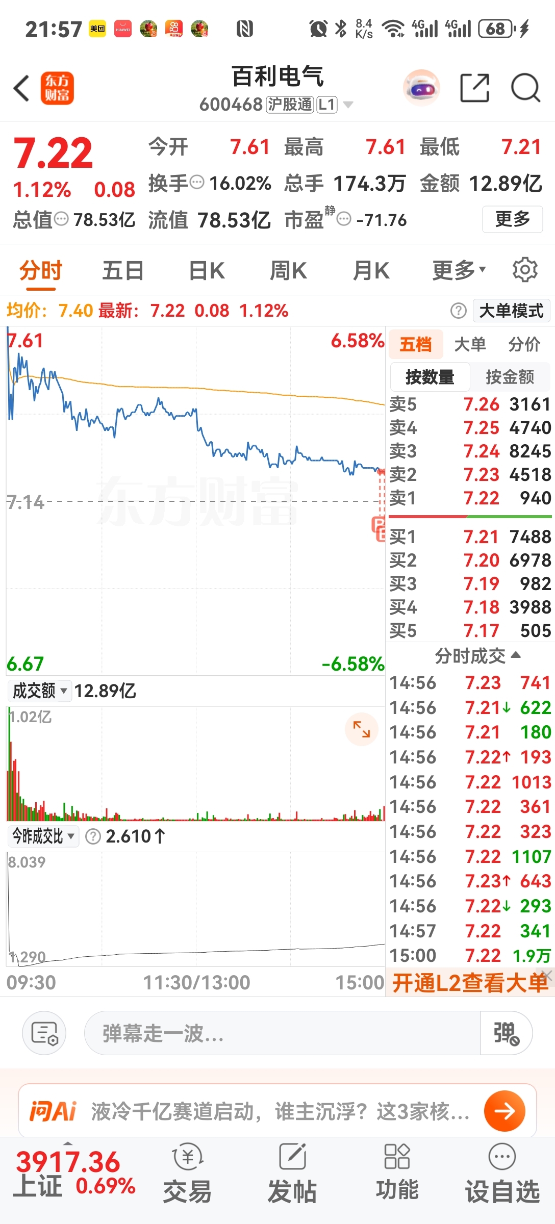$百利电气(SH600468)$ 周一盘后复盘,全天走势完全与上帖盘前预测一模一样,高开后盘中震荡,未能有效突破7.41压力位后回撤,但很有意思的是尾盘来一波下杀至7.21当天最低位后,敢死队资金集中买入,尾盘最后一单还来1.9万手换手卖单