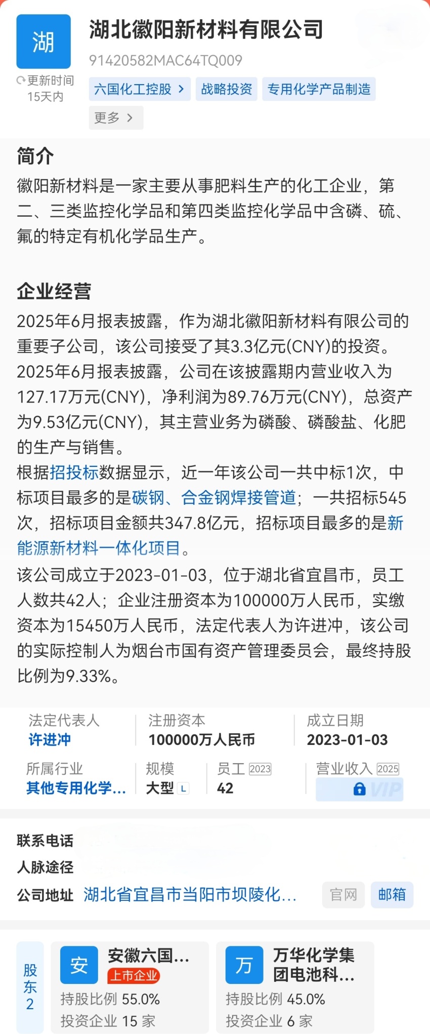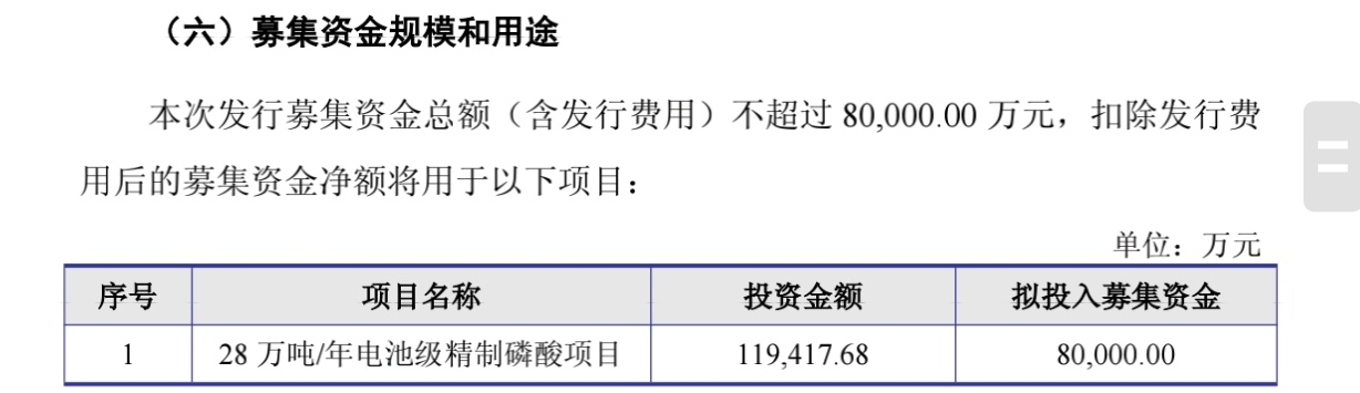 六国化工定向增发为28万吨/年电池级精制磷酸项目,项目由六国化工控股子公司湖北徽阳新材料有限公司实施。