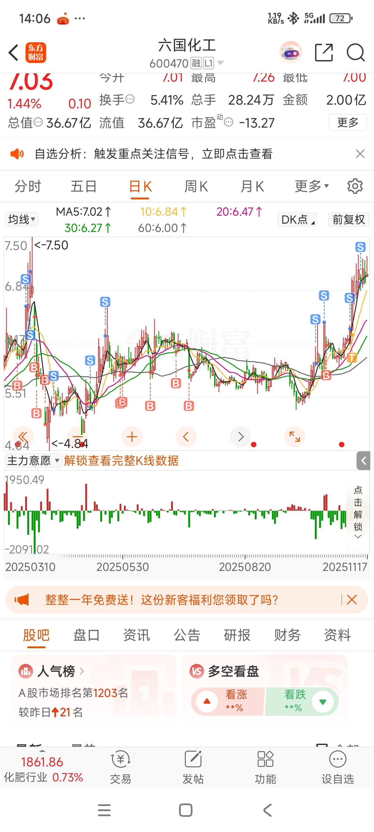 $六国化工(SH600470)$ 操作这个票也有几年了,这个位置,这个形态、很危险很危险。留有底仓继续观望。