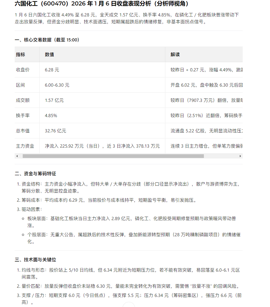 $六国化工(SH600470)$ 2026年1月6日六国化工收盘简评
