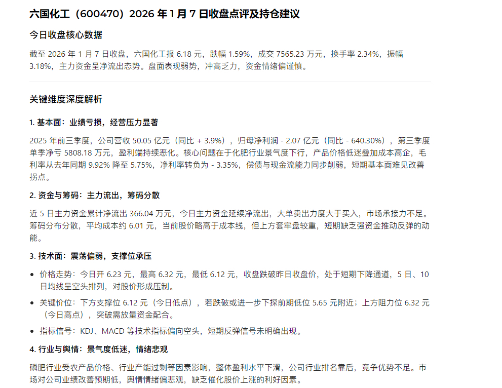 $六国化工(SH600470)$ 2026年1月7日六国化工收盘简评