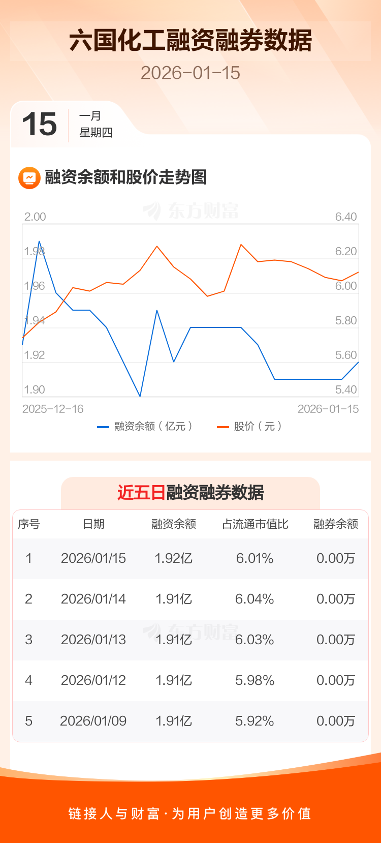 交易所最新数据显示,六国化工于2026年1月15日获融资买入1174.83万元,融资偿还1094.49万元,当日融资净买入80.34万元。目前,该股融资余额1.92亿,占流通市值比例为6.01%。