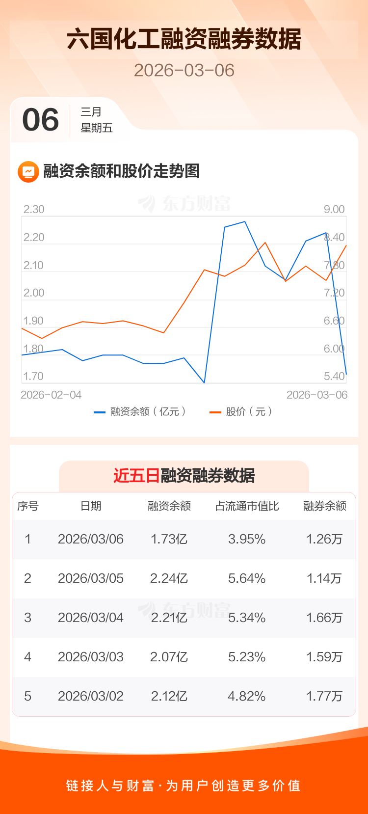 交易所最新数据显示,六国化工于2026年3月6日获融资买入3474.51万元,融资偿还8603.28万元,当日融资净偿还5128.78万元。目前,该股融资余额1.73亿,占流通市值比例为3.95%。