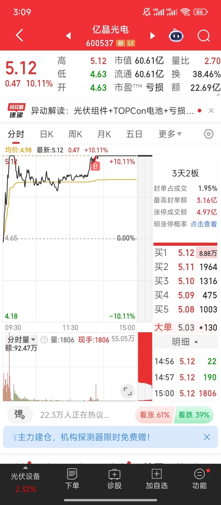 2、$华光环能(SH600475)$ 、$亿晶光电(SH600537)$ 新上车。