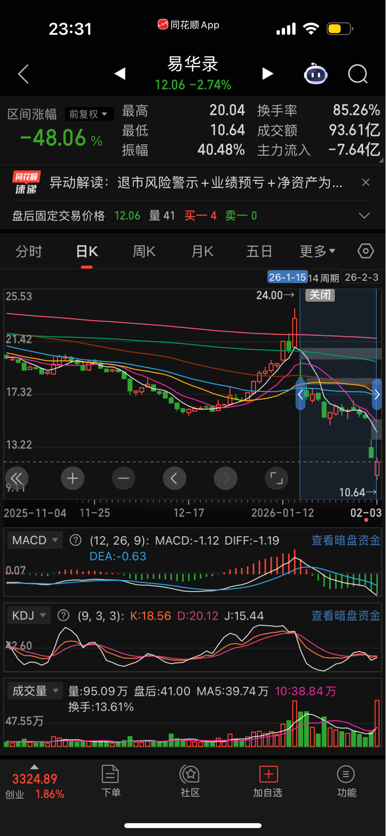 什么都不想知道,我只知道易华录净值为负的退市风险公告后跌了48%。湘邮科技短线的