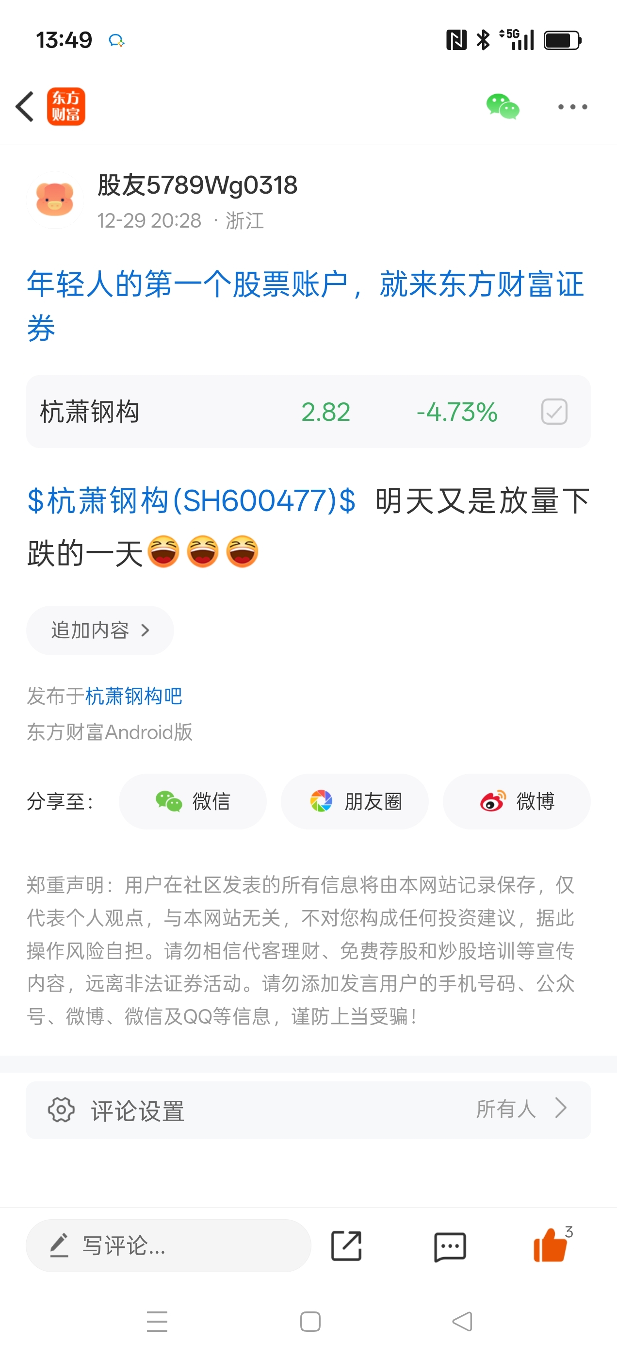 温馨提示: 1.根据《证券法》规定,禁止编造、传播虚假信息或者误导性信息,扰乱证券市场;2.用户在本社区发表的所有资料、言论等仅代表个人观点,与本网站立场无关,不对您构成任何投资建议。用户应基于自己的独立判断,自行决定证券投资并承担相应风险。《东方财富社区管理规定》