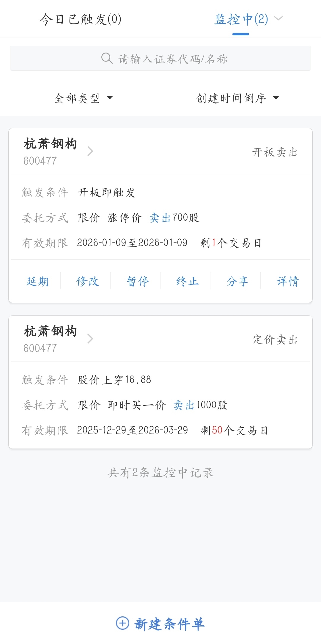 $杭萧钢构(SH600477)$ 设置一个条件单打卡下班