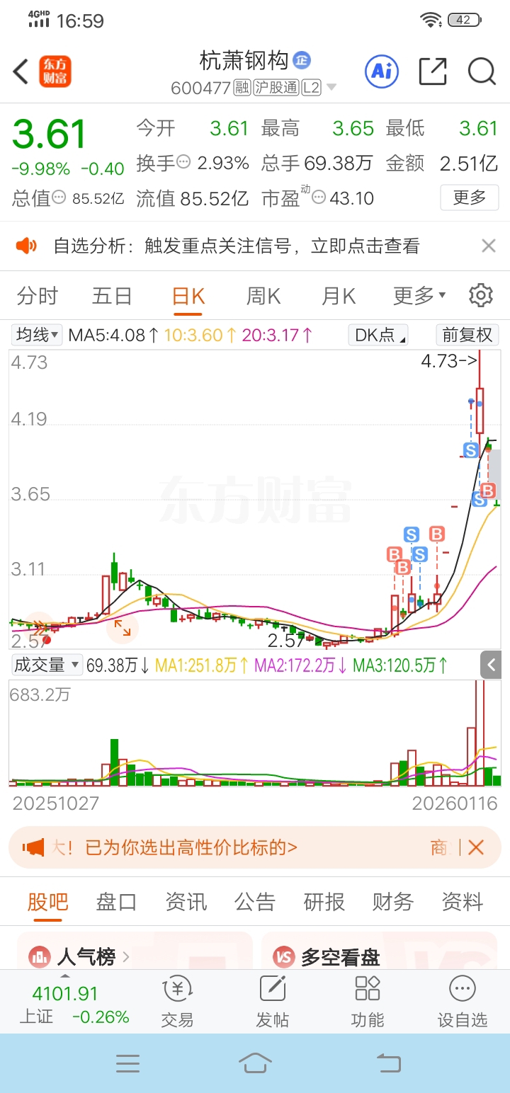 $杭萧钢构(SH600477)$ 下周一开盘跌停加杠杆,不要跟我讲逻辑什么的蹭航空概念的话,但凡航天票回暖,这票绝对涨停,按死这两天你们没看到主力在偷偷吃筹码吗?昨天今天竞价开盘想卖的哪天不给你机会跑?下周一再来个跌停开我跟你讲偷着笑吧,绝对给你撬开