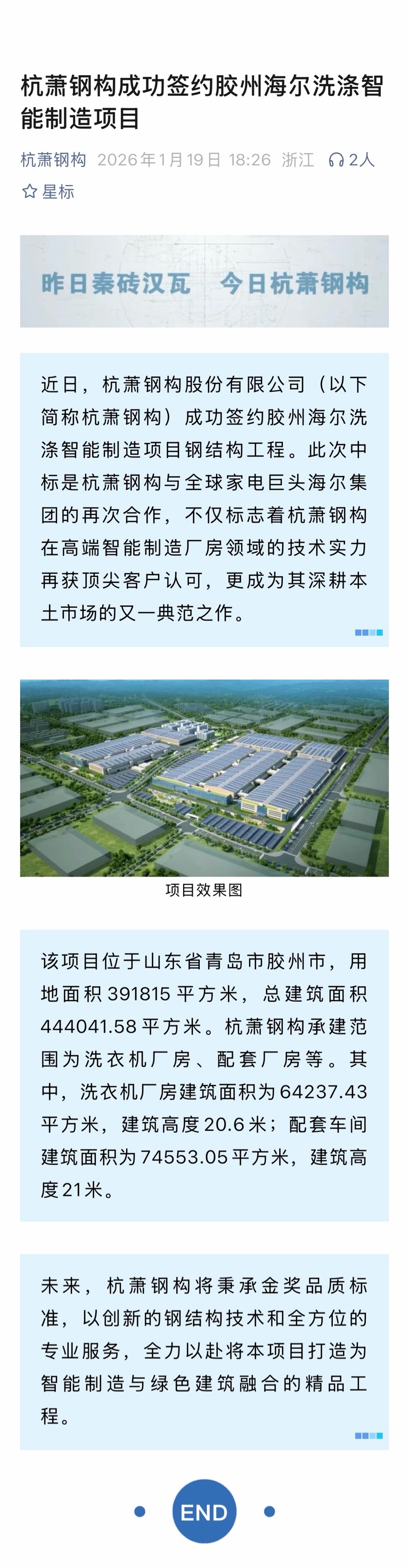 杭萧钢构成功签约胶州海尔洗涤智能制造项目