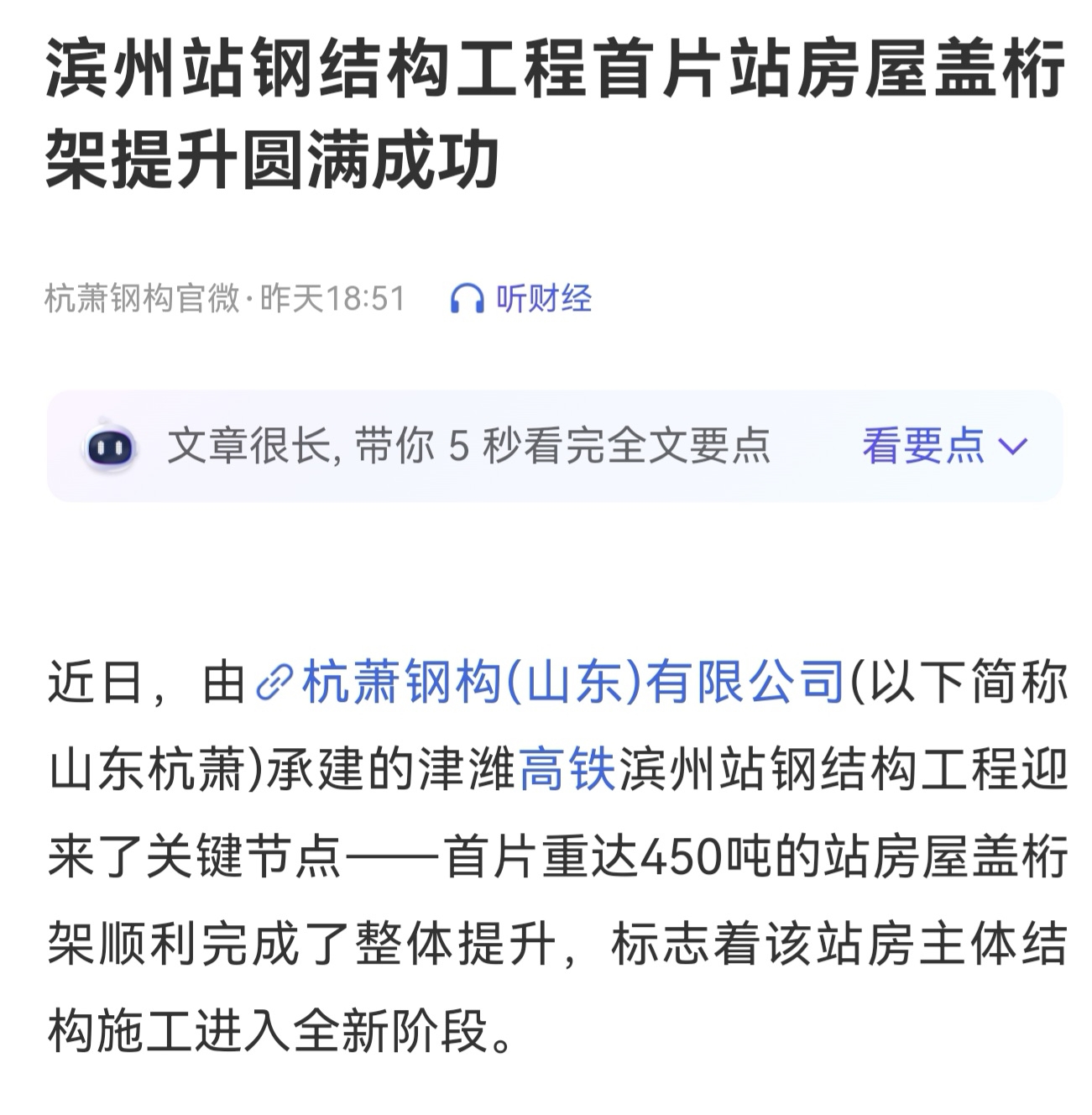 滨州站钢结构工程首片站房屋盖桁架提升圆满成功