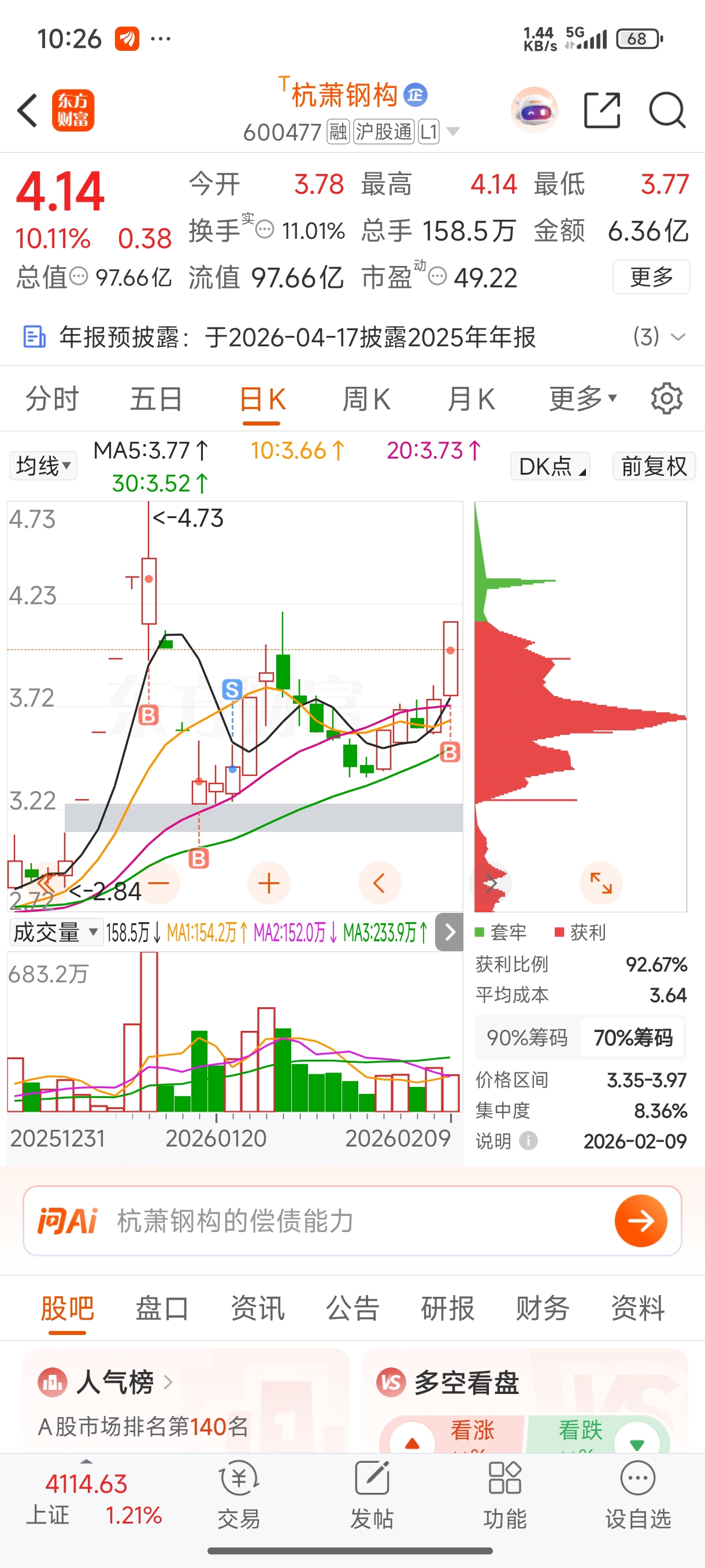 $杭萧钢构(SH600477)$ 我胡汉三又回来了,鬼使神差加了自选,今天ai又又又一次让人失望了,这票今天算光伏电池跟风,抛压大,但是从形态上看有主动性,看今明两个涨停能不能硬吃套牢盘,这样有新高浪的机会