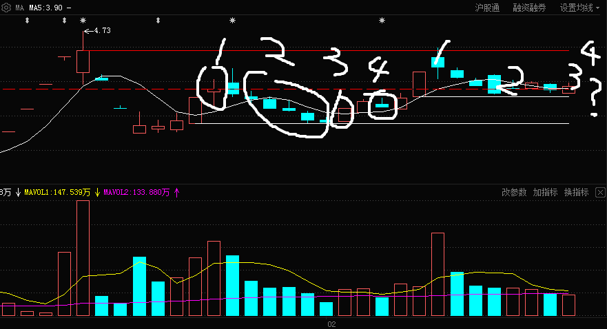 7. 关于它的买点,真的非常清晰了。这个票的庄,很单纯的人。位置1 是主力冲高拿货,试盘前方压力,毕竟4.73挂了那么多人;位置2,主力锁仓,让市场自由交易,所以我们看到成交量是有序下跌每天缩量1/3到1/4,这非常好。这说明主力在认真干活。位置3,缩量到比较极致的状态后,主力二次进场,我们看到成交量放出倍量,如果不是很倍量,也行吧。这个时候,这个主力二次进场的动作,要让K突破5日线,要上去的,不然不是好的放量,如果放量了,还上不去,说明前期洗盘洗过头了。但是这里我看到杭萧,前一个波浪放了一个阳K ,就站上5日线了,这个主力洗盘非常好,控盘也很高。位置4,等K 站上5日线后,等它一个回踩,这里的回踩必须、必须、必须不破5日线,那么这里就是买点了,也就是位置4.这里可以买,或者再等次日或者再过几天,回踩5日线不破后,拐头向上走起就赶紧买入。也是非常好的。