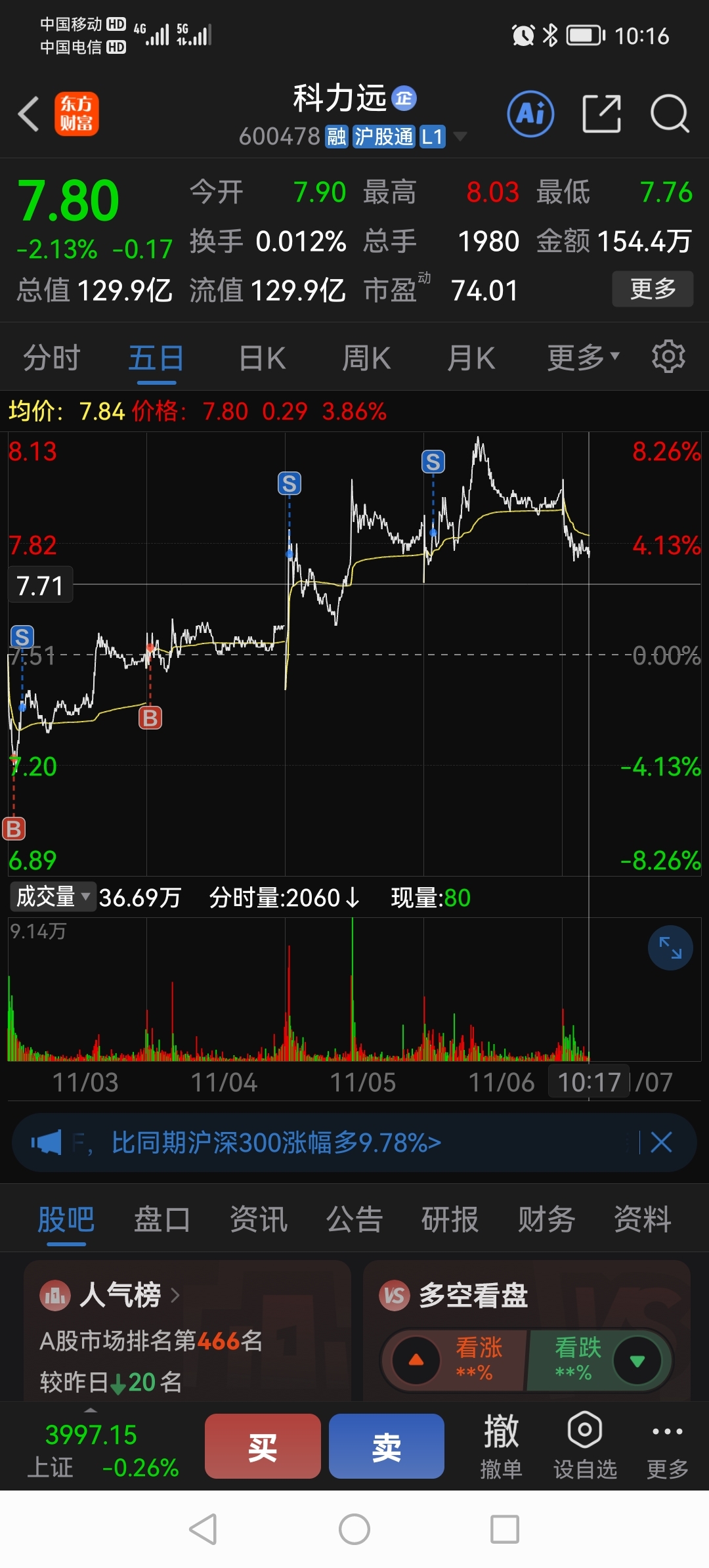 不破5日线,可以加仓做t。现在再等等,看他能否站稳。