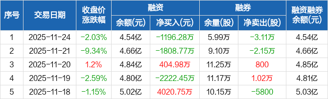 融资方面,当日融资买入3153.45万元,融资偿还4349.73万元,融资净偿还1196.28万元。融券方面,融券卖出6000股,融券偿还3.71万股,融券余量5.99万股,融券余额40.43万元。融资融券余额合计4.54亿元。
