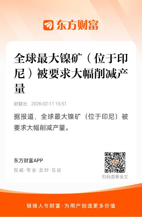 据报道,全球最大镍矿(位于印尼)被要求大幅削减产量。