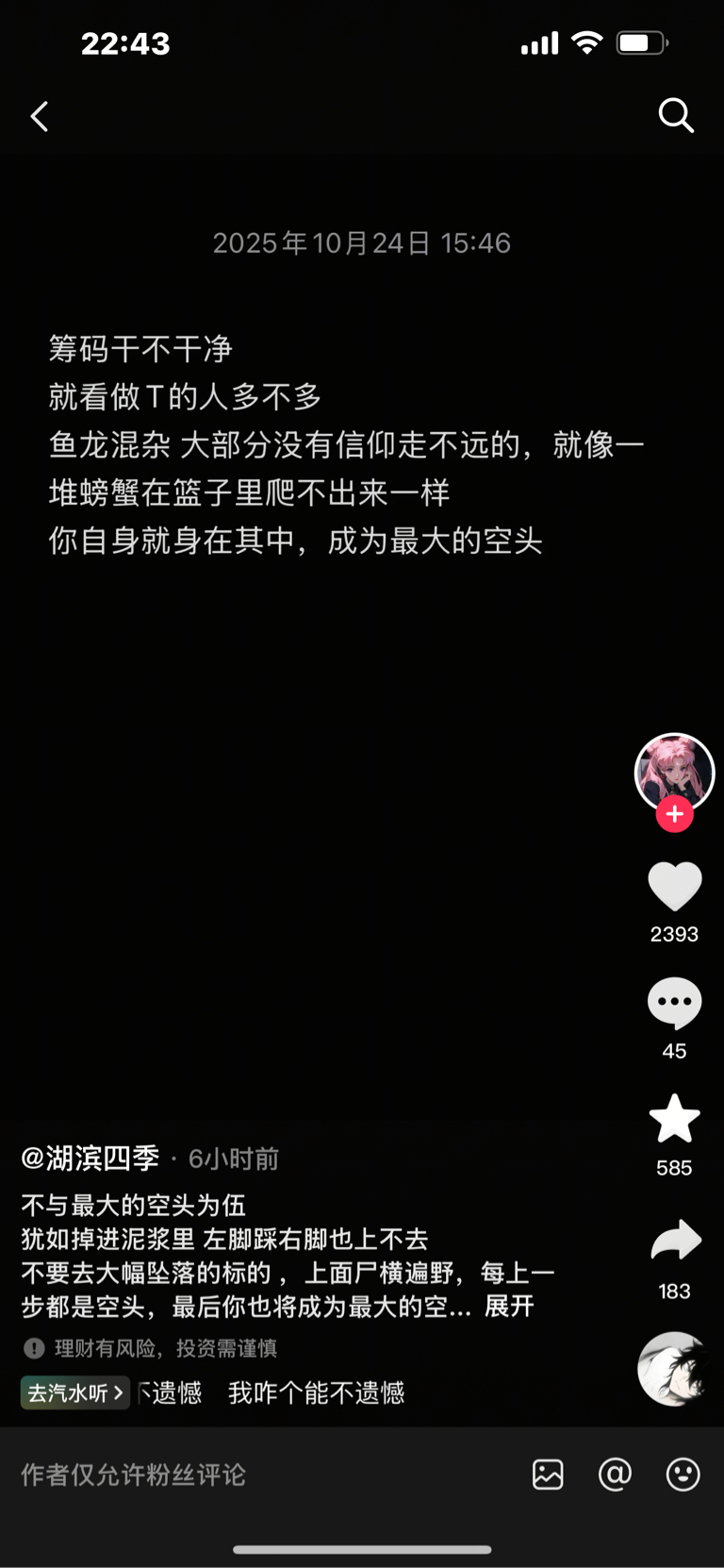 郑重声明:用户在财富号/股吧/博客等社区发表的所有信息(包括但不限于文字、视频、音频、数据及图表)仅代表个人观点,与本网站立场无关,不对您构成任何投资建议,据此操作风险自担。请勿相信代客理财、免费荐股和炒股培训等宣传内容,远离非法证券活动。请勿添加发言用户的手机号码、公众号、微博、微信及QQ等信息,谨防上当受骗!
