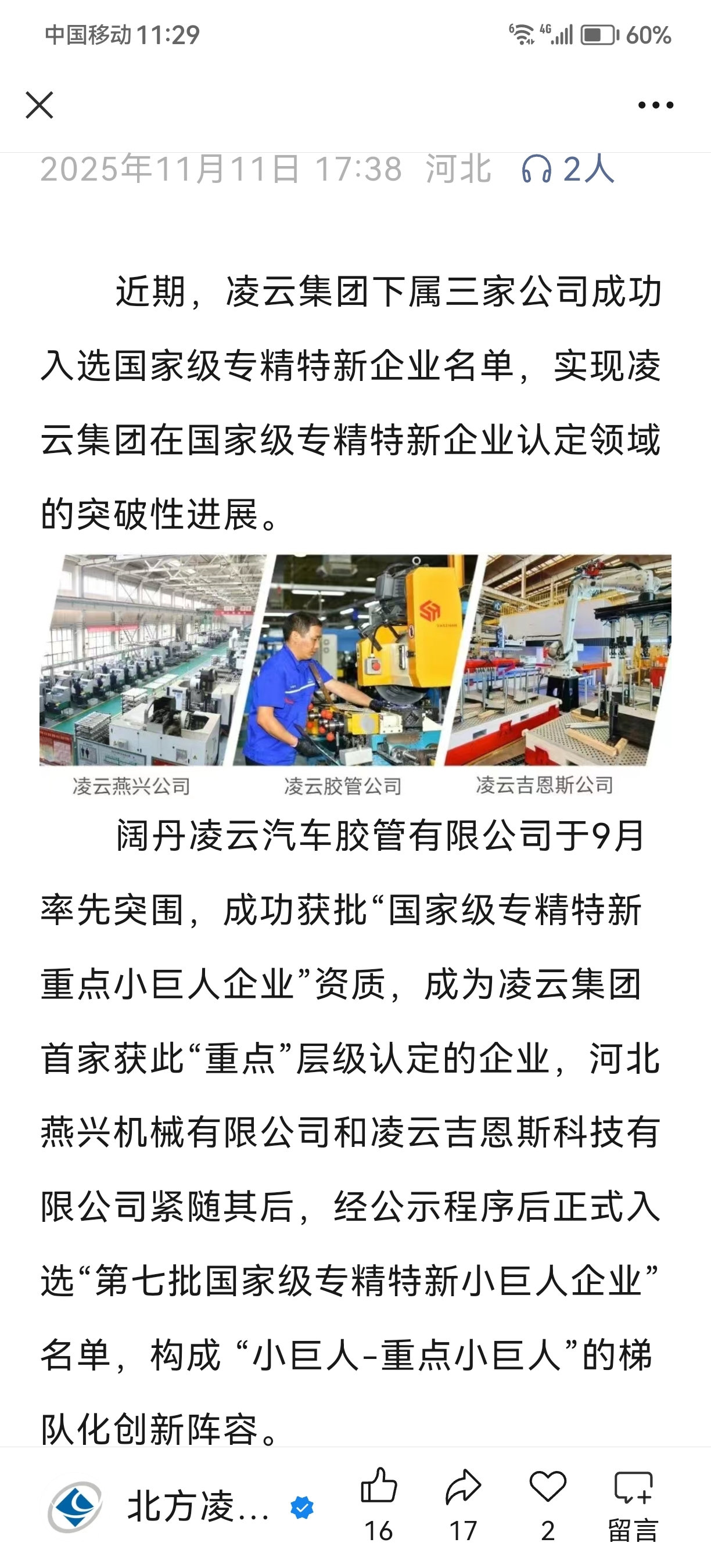 $凌云股份(SH600480)$ 凌云股份三家公司成功入选国家级“专精特新”小巨人企业名单。阔丹凌云汽车胶管有限公司于9月率先突围,成功获批“国家级专精特新重点小巨人企业”资质,成为凌云集团首家获此“重点”层级认定的企业。