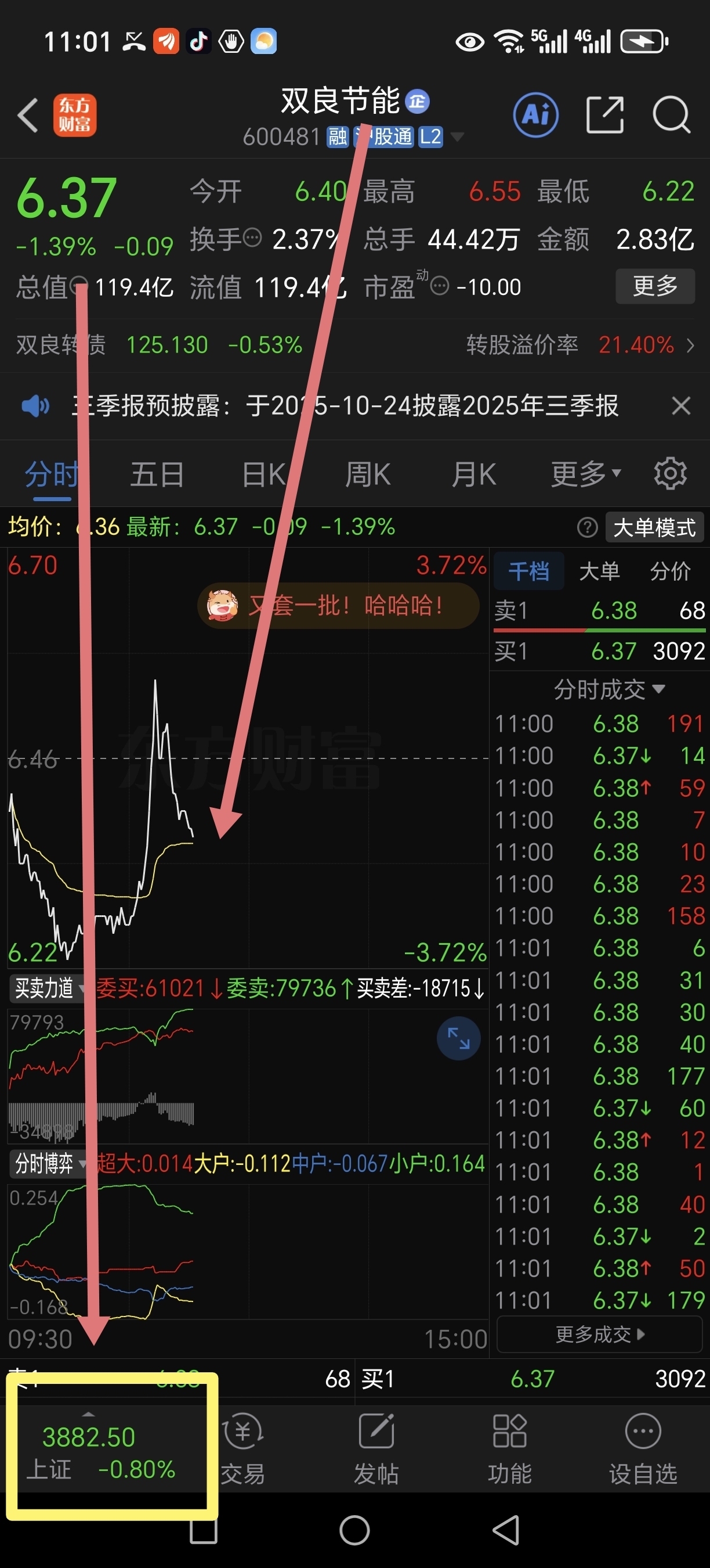$双良节能(SH600481)$ $上证指数(SH000001)$ 纸数又跳水靠近5日线了,双良冲高回踩至日均线6.36元上方了,这可能是个好买点。