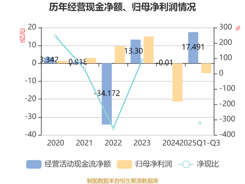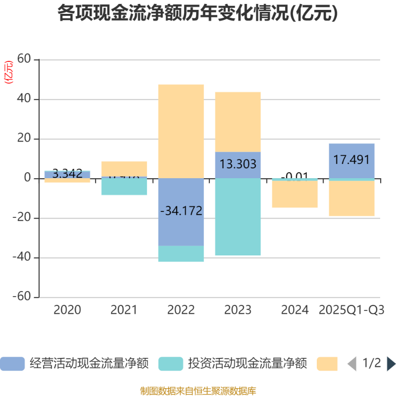 2025年前三季度,公司经营活动现金流净额为17.49亿元,同比增加28.25亿元;筹资活动现金流净额-17.76亿元,同比减少16.71亿元;投资活动现金流净额-1.36亿元,上年同期为-6783.23万元。